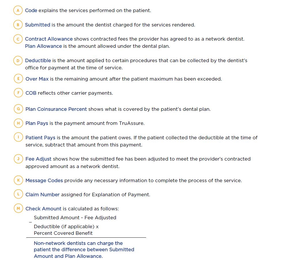 After a patient with TruAssure Insurance Company® coverage has an appointment and a claim is submitted, you’ll receive an EOP from TruAssure outlining the procedures performed, reimbursements and/or denials based on the patient’s dental plan and the provider's approved contract as a participating dentist.